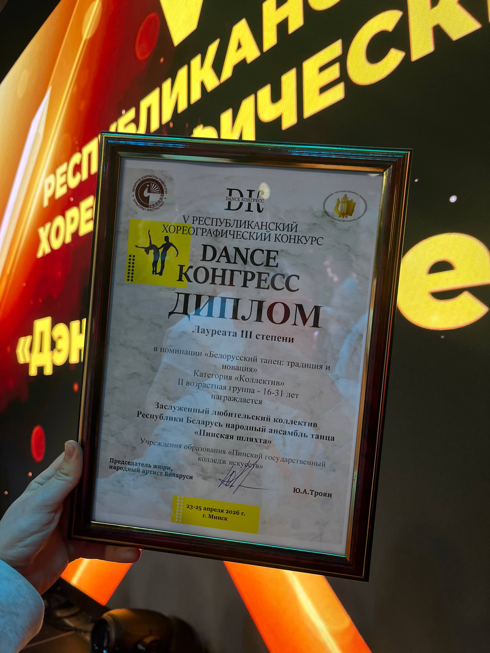 Заслуженный любительский коллектив Республики Беларусь народный ансамбль танца «Пинская шляхта» УО "Пинский государственный колледж искусств" принял участие в V Республиканском хореографическом конкурсе «Дэнс-конгресс», который с 23 по 25 апреля 2026 года проходил в г. Минске.